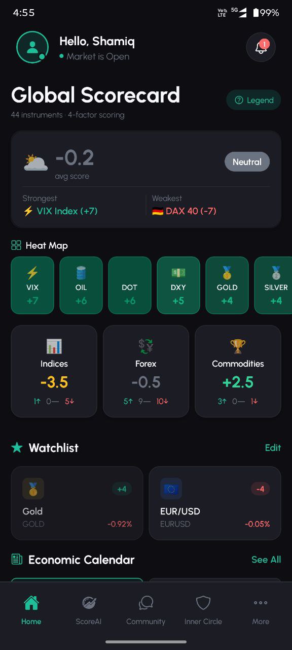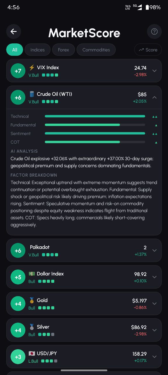 Technical, Fundamental, Sentiment, and COT analysis collapsed into a single actionable score for 44 instruments. See the entire market in one glance.