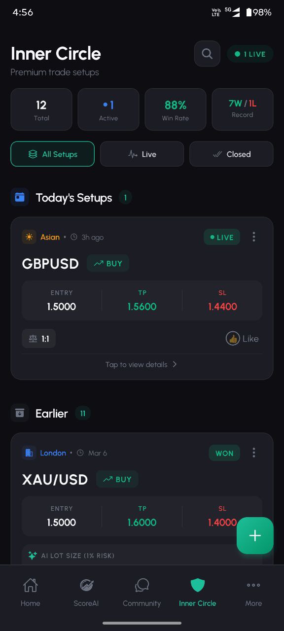 Exact Entry, TP, and SL on every setup. AI-calculated lot sizes based on your risk. Every trade tracked publicly — wins and losses.