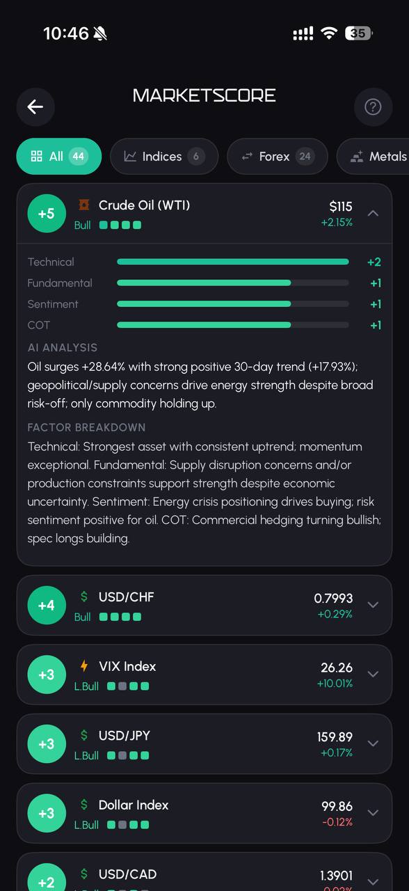 Technical, Fundamental, Sentiment, and COT analysis collapsed into a single actionable score for 44 instruments. See the entire market in one glance.